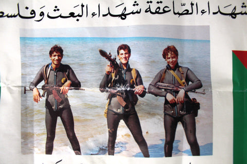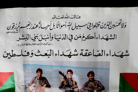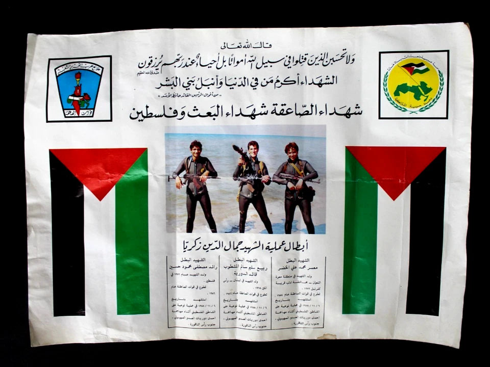 - Note: This poster commemorates the "Heroes of the Operation of Martyr Jamal al-Din Zakaria," a military mission carried out by the Al-Sa'iqa forces (also known as the Vanguard for the Popular Liberation War), which is the Palestinian branch of the Syrian-led Ba'ath Party. The operation targeted an Israeli occupation patrol on the Palestinian coast south of Rosh HaNikra (Ras al-Naqoura. The poster's text at the top identifies these individuals as "Martyrs of Al-Sa'iqa, Martyrs of the Ba'ath and Palestine.