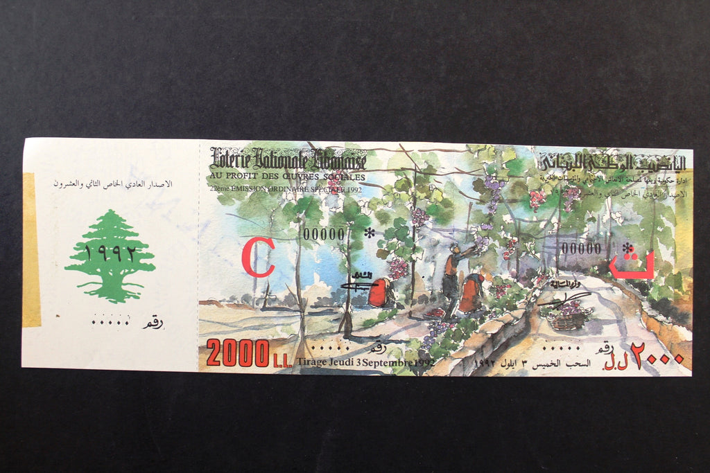 Lebanon National Lottery (Specimen) Loterie Nationale Libanaise 1992 Sept. 3 ورقة اليانصيب الوطني اللبناني