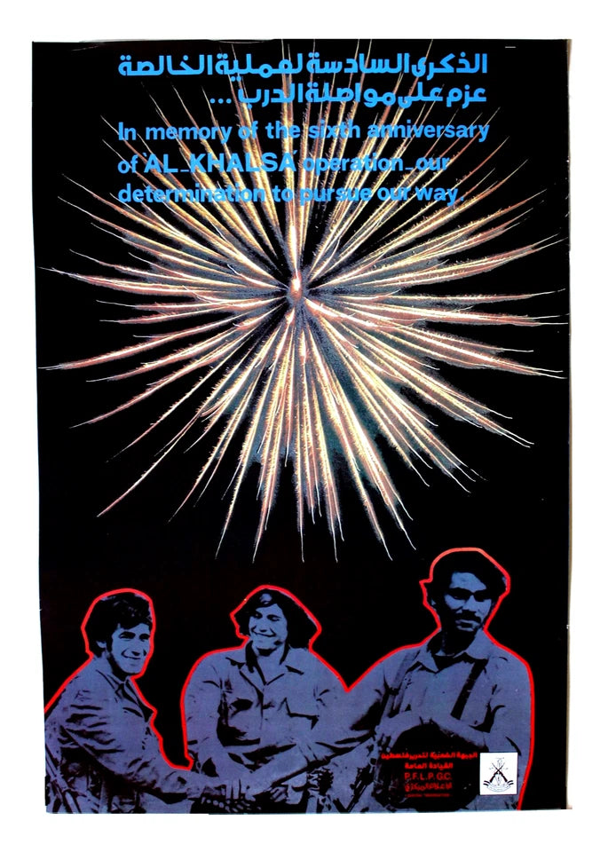 - Note: The Al-Khalsa operation refers to a military raid carried out by a PFLP-GC group on April 11, 1974. The group stormed a school and a block of apartments in the settlement of Kiryat Shmona, where they took hostages and engaged in a battle with Israeli forces. They demanded the release of 100 prisoners. The three individuals pictured at the bottom of the poster are likely the members of this group who were killed in the operation: Menir Al-Maghribi (Abu Khaled), Ahmed Al-Sheikh Mahmoud, and Yassin Musa Fazza Al-Huzani (Abu Hadi).