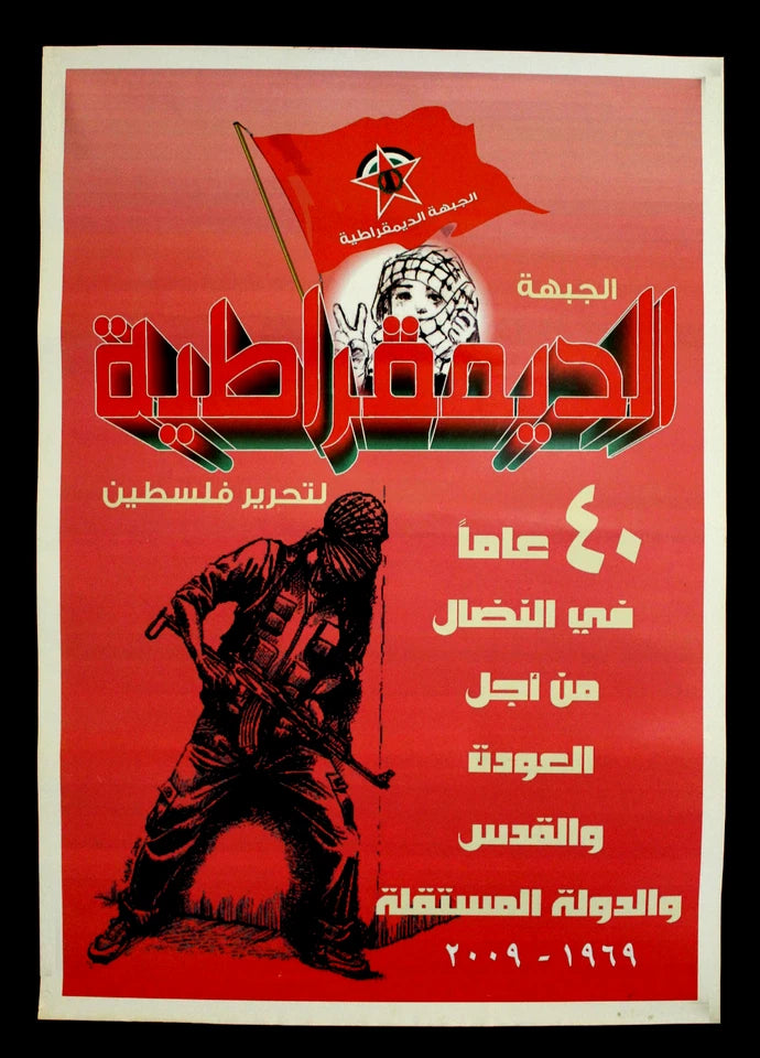 This poster is an official commemorative item celebrating the 40th anniversary of the Democratic Front for the Liberation of Palestine (DFLP).