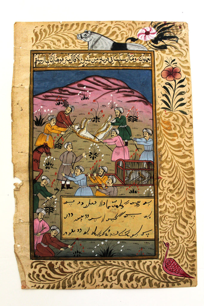 - Note: A leaf from an ancient Mughal book with a very finely painted miniature of group of men hunting.