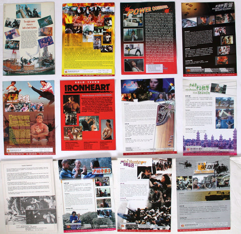 This Lot features several vintage Hong Kong action and martial arts movie flyers from the late 1980s and early 1990s. Notable actors prominently featured across these flyers include Jackie Chan, Andy Lau, Moon Lee, Bolo Yeung, and Brigitte Lin.